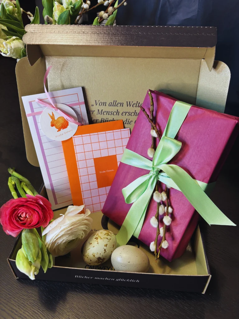 Dieses Jahr ist Ostern mehr als ein Datum im Kalender. Es ist ein Päckchen, das bei Dir klingelt. Du öffnest es – und da ist es: Dein Buch, liebevoll für die Osterzeit verpackt. Daneben Eierfarben, die nach Frühling rufen. Ein Notizblock für all die Gedanken, die der April mit sich bringt. Und eine Karte mit „Frohe Ostern“ – zum Behalten oder Weiterschicken, an jemanden, dem Du eine Freude machen möchtest.